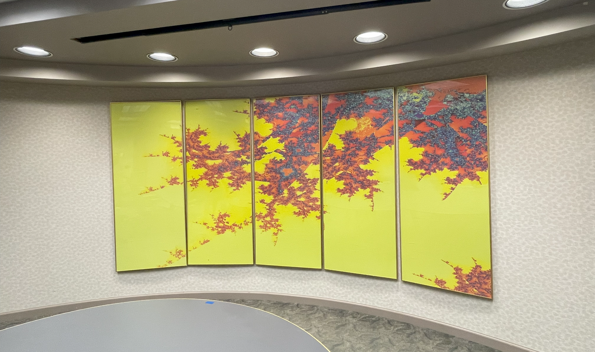 In 1998, the Clinton-Eaton-Ingham Community Mental Health Agency opened a new building for mental health services in the Tri-County area. Elinor Holbrook was Chair of the CEI Community Mental Health Board during that time and believed there should be art on the new walls for everyone who visited to enjoy. She asked Roy Saper of Saper Art Galleries about art designed for buildings with heavy public use and together they worked to brighten the interior hallways and office spaces. She then turned to staff to start a rotating art display by and for clients of the facility, which still exists. Larry Holbrook, her husband, had recently retired and was actively applying his knowledge and love of mathematics in the creation of digital art. He was gaining recognition through writing and speaking on the relationship of mathematics and art as well as gallery exhibits of his art. She asked him if he would like to create a large five panel piece, “Zen Maple” for the new conference room and he gladly did, donating his completed work to CEI. Larry passed away in 2002, leaving behind hundreds of files of original digital art based on his mathematical formulas. “Zen Maple” has been copyrighted and is an example of his unique early attempt to translate digital tools into art.